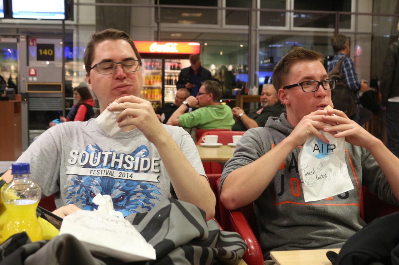 Doch es gab noch eine kleine Hürde zu meistern: Die Zutrittskontrolle in den Boarding-Bereich, der von böse-schauenden Security-Mitarbeitern durchgeführt wurde. Timo, Marc und ich wurden kurz befragt, wohin es genau gehen sollte, was der Grund für unsere Reise ist und so weiter. Alex dagegen lief einfach an den Mitarbeitern vorbei und kam unbemerkt (Und auch ohne es selbst zu realisieren...) in den Boarding-Bereich. Wir erhielten dagegen auf unserem Reisepass einen seltsamen gelben Sticker, dazu jedoch später mehr.