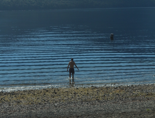 Nach dem Abstieg „flogen“ wir das letzte Stück bis nach Te Anau. Zum ersten Mal überhaupt waren die Straßen eben und wie mit dem Lineal gezogen, sodass man durchgehend die maximal zugelassenen 100km/h fahren konnte. Als wir Te Anau erreichten, waren wir sofort begeistert. Das ist das optimale Urlaubsparadies. Der von Bergen und Wäldern umgebene Te Anau See grenzt an die gleichnamige Kleinstadt an und bietet eine Liegewiese für Massen an Touris. Doch die Wiese war bis auf ein paar einzelne Sonnenanbeter leer. Diese Gelegenheit nutzten wir ohne zu zögern und sprangen ins kühle nass.