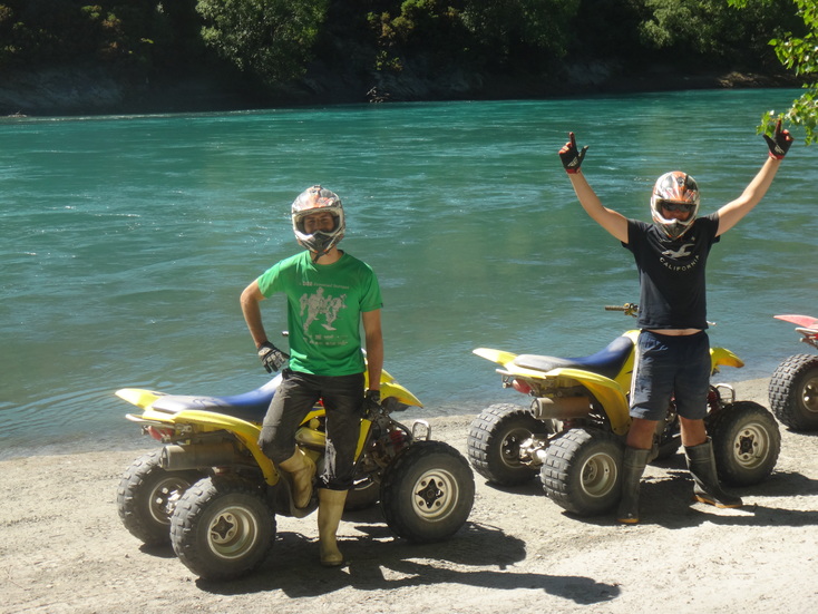 Der zweite Tag in Queenstown sollte wieder ein Action-Tag werden. Da Queenstwon für seine Outdoor-Abenteuer bekannt ist, haben wir uns fürs Offroad-Quad-Fahren angemeldet. Wir mussten dafür leider früh um 6.30Uhr aufstehen, da wir bereits um 8.50Uhr in Queenstown abgeholt wurden. Also kurz gefrühstückt und ab in die Stadt. Von unserem Parkplatz waren es nur 15 Minuten zu gehen. Pünktlich wie die Maurer waren wir da und wurden nach der Anmeldung und Begrüßung mit dem Kleinbus zusammen mit acht weiteren Action-Urlaubern aufs riesige Offroad-Gelände des Veranstalters gefahren. Hier bekamen wir eine Einführung fürs Quad von „Matt“ und schon ging es los. Jeder hatte ein eigenes Quad und einen Motocross-Helm bekommen. In kleinen Gruppen durften wir unseren Guides hinterher brettern. Eine gichtig coole Erfahrung! Es ging über Stock und Stein, durch Bäche und holprige Pisten. Sogar kleine Schanzen waren hier und da in der Strecke eingebaut. Das alles im schönen neuseeländischen Bergpanorama, toll!