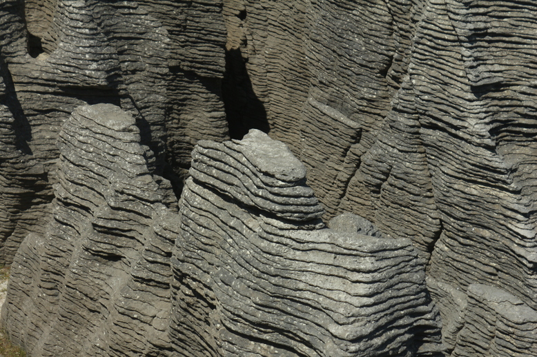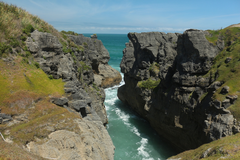 Dann ging es endlich zu den berühmten Pancake Rocks. Der Name kommt von der unverkennbaren Form aufeinander gestapelter Pfannkuchen. Die Felsformationen sind vor tausenden von Jahren irgendwie unter Wasser entstanden. Wie genau, das weiß man bis heute nicht, so besagt eine Info-Tafel. Unter den Pancake Rocks sind ähnlich wie bei Jacks Blowhole große unterspülte Becken entstanden. In denen schlagen die Flutwellen bis zu 15m hoch an den Wänden hinauf. Echt beedindruckend!