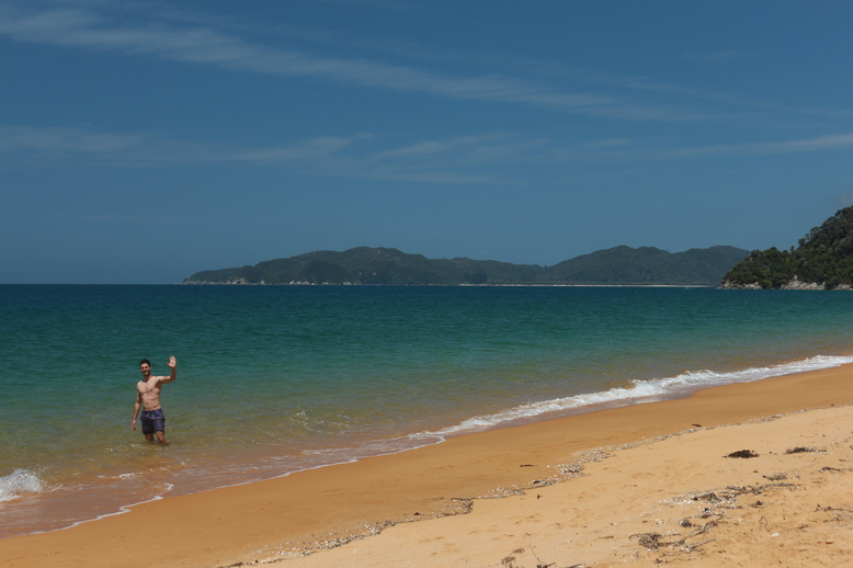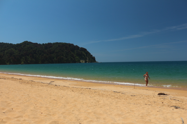 Nachdem wir dann in unsere Lebensmittel-Vorräte aufgefüllt haben, ging die Reise zu Johannas absolutem Höhepunkt unserer Reise. Der Abel Tasman National Park (ATNP). Das nach einem holländischen Entdecker benannte Gebiet ist weltweit für seine atemberaubenden Strände und dem großen DOC-Wanderweg (Abel Tasman Coast Track) bekannt. Der Weg dort hin war umso steiniger: Nach einer Bergüberquerung des Takaka Hill mit gefühlt tausend Kurven und Serpentinen fuhr man bis zu Küste, um dann auf einer unwegsamen Schotterstraße für zehn Kilometer weitere 1000 Kurven zu überwinden. Durchschnittsgeschwinditkeit 30km/h. Mehr war nicht drin. Doch es hat sich mehr als gelohnt. Als wir endlich am „Totaranui Beach“ ankamen waren wir sprachlos. Wir kamen uns vor wie im Paradies - oder zumindest in der der Karibik. Das Wasser war türkisblau und glasklar. Der Strand war gold-gelb (Wir nannten ihn deshalb auch Semmelbrösel-Strand