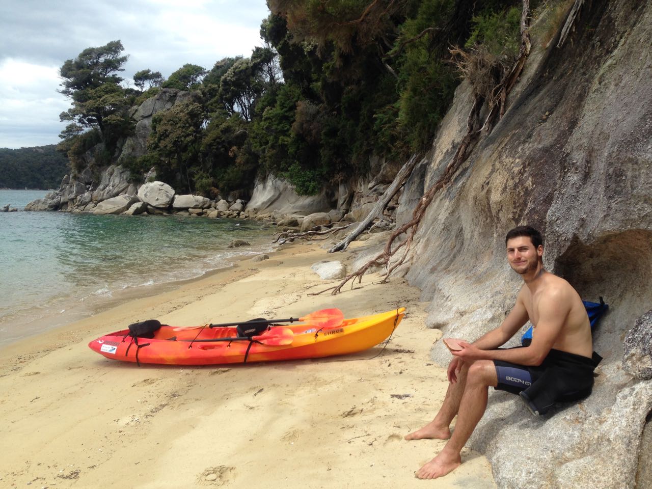 Action stand heute wieder auf dem Programm. Wir mussten unseren geliebten Totaranui Camp verlassen und fuhren die ganze Strecke über Schotter und Berge und den 2000 Kurven zurück bis zum eigentlichen Startpunkt des AT Coast Track – das Fischerdorf Marahau. Hier buhlen zahlreiche Kayakverleiher um die Gunst der Reisenden. Wir entschieden uns für den am wenigsten seriösen 0815-Verleiher. Ohne ein Guide, oder ein Programm wollten wir einfach für 4 Stunden ein Kayak mieten. Und dieser Typ bot als Einziger genau nicht mehr und nicht weniger.