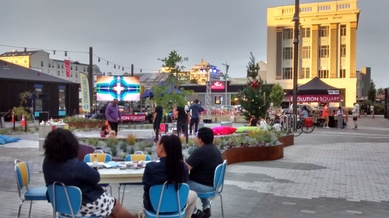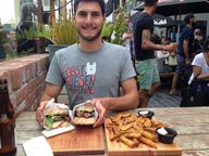 Den weiteren Abend wollten wir nutzen, um uns noch einmal ins Nachtleben von Christchurch zu stürzen. Wir gingen zu Fuß durch den Hagley Park und landeten irgendwann auf einem großen Platz, auf dem eine provisorische Bühne aufgebaut war. Dort spielte eine Band. Nebenan grenzte die „Little High Eatery“. Das ist ein Gebäude in dessen Eingangshalle sich zahlreiche Restaurants eingemietet haben. Es war wahnsinnig viel los und die Leute waren wirklich gut drauf! Wir bestellen bei den Bacon Brothers jeweils einen Burger mit Fritten.