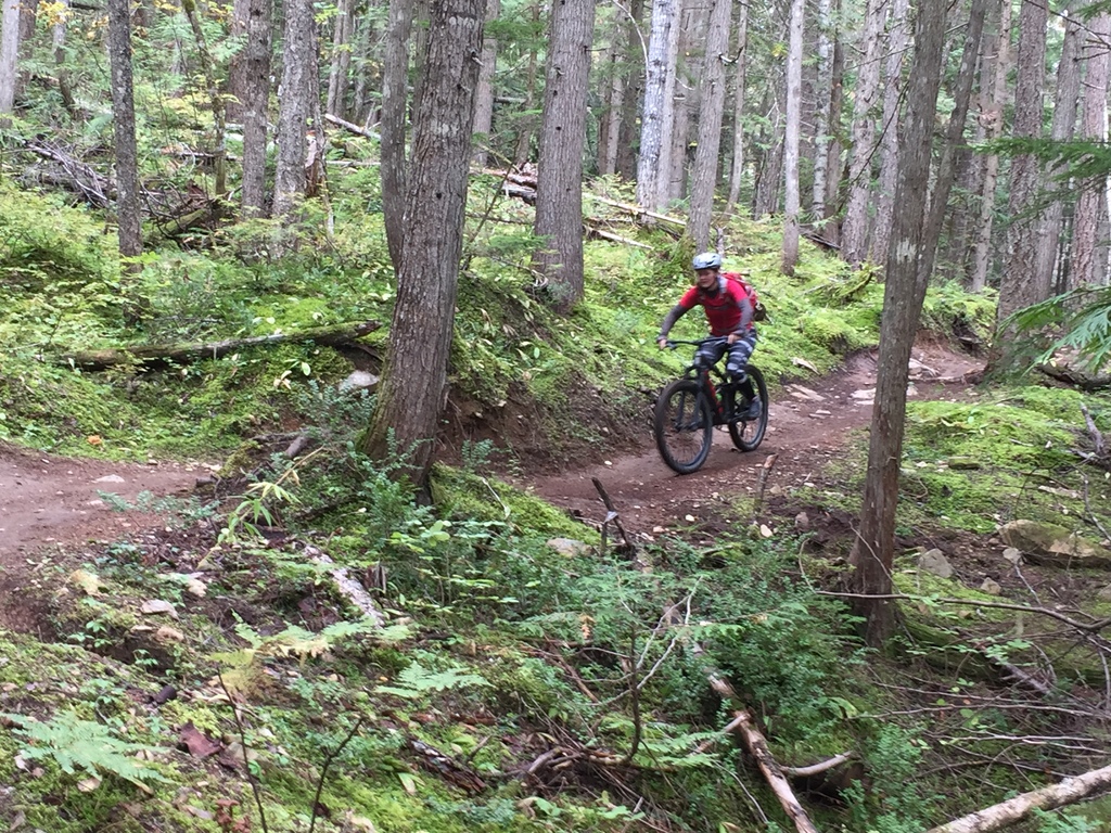 Wir fuhren zum Start des Biking-Gebiets rund um den Mount Begbie. Der Trail, den der Verkäufer uns empfohlen hat hieß „Flowdown“ und war von mittelschwerer Stufe (Intermediate). Für mich passte es optimal, doch Johanna hatte bereits beim Aufstieg leichte Probleme. Technisch war der Trail schon anspruchsvoll. Mountainbiken ist wie eine Rätselaufgabe: Bei jeder Kurve oder bei jedem Hindernis muss man mehrere Dinge gleichzeitig beachten und sich für den einen Weg entscheiden. Wie verlagere ich mein Gewicht? Wann und wie stark bremse ich? Wo fahre ich durch oder drüber? Das Hinterrad muss ja separat „berechnet“ werden, denn das fährt ja eine engere Kurve. Wann trete ich und wann mache ich eine kurze Pause, sodass die Pedale nicht aufsetzen? Diese und weitere Entscheidungen sind in wenigen Sekundenbruchteilen zu treffen. So fuhren wir etwa zwei Stunden bergauf. Aber es lohnte sich! Der Downhill-Trail machte richtig Laune, sogar ein paar Sprünge waren dabei. Es ging über Wurzeln, Felsbrocken, dünne Holzstege und durch Matsch. Erst nach einer Weile hatte auch Johanna die Technik raus, doch plötzlich hatte auch sie den Spaß daran gefunden. Und das alles bei perfektem Wetter, herrlich!