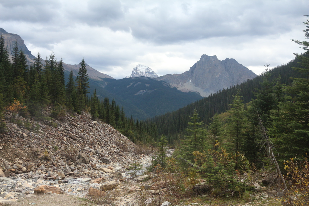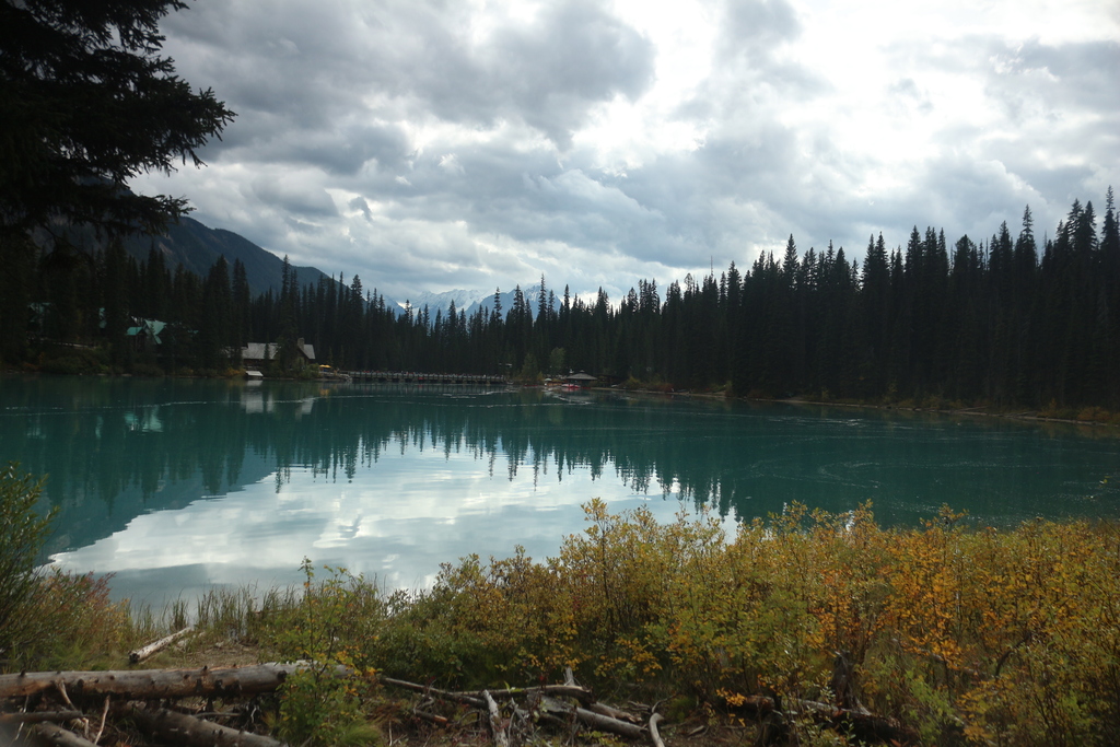 Eigentlich wollten wir heute mit der Gondel zum Mt. MacKenzie fahren. Doch leider machte uns das Wetter wieder einmal einen Strich durch die Rechnung. Es war sehr wolkenverhangen, wodurch wir sicher keine gute Sicht ins Tal hätten. Dadurch beschlossen wir einfach in Richtung des Banff National Parks zu fahren und dort auf dem Weg eine kleine Runde zu laufen. So kam es dass wir schließlich im Yoho National Park gelandet sind. Dort gibt es den unglaublich blauen Emerald Lake, der leider aber auch zu einem der touristischen Highlights gehört. Deshalb müssen wir ca. 1km entfernt vom Parkplatz am Straßenrand parken.